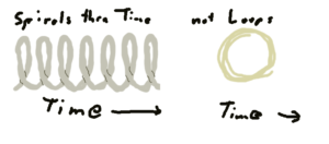 Feedback plays a prominent role in systems thinking because it’s what usually underlies a dynamic equilibrium. The official term is “feedback loops” but when I tried to teach feedback loops to kids, they got confused. They couldn’t see how the feedback could loop back in time to the starting place. They were right; it doesn’t. Their legitimate confusion led me to think of feedback as spiraling forward through time.