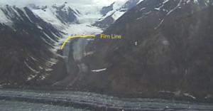 Glaciers can’t be born or grow below the firn line. They can only begin above that elevation, up where the snows can accumulate year after year. Up there, however, as the snow transforms into ice, it becomes “plastic”, capable of distortion and flowing. On the steep slopes of mountains, the mass of ice starts to flow downslope. Eventually it will flow down across the firn line. Crossing the firn line is moving down into the area where more snow will melt than falls during the year. The glacier is crossing into “enemy territory” and it starts to thin. (The area below the firn line is called the zone of ablation. Ablation is a scientific word that recognizes that melting is not the only way ice is leaving the glacier. Some of it is evaporating and some of it is sublimating (going directly from the solid state to a gas)).