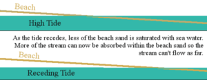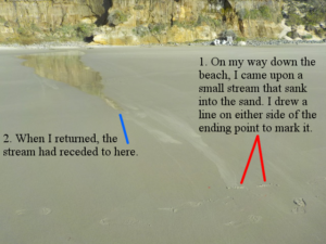 >I mark things to help me understand rates. Walking along a beach as the tide receded, I come upon a small stream seeping from the cliffs and disappearing into the sand at a certain point. I mark this point. On my return later, my marks reveal that the stream no longer flows as far. It has receded ten feet up the beach. Why?[1]