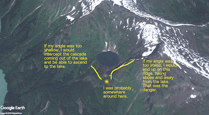 Had my angle been too steep? That was the real danger. Perhaps the reason I hadn’t reached the lake was that, within the cloud, I had already passed it. I had no baseline to catch me if my angle was too steep. Perhaps I was on the slopes above the lake! If so, every step was carrying me farther from the lake, carrying me into greater danger of steeper, more exposed slopes. Perhaps I should start angling down across the slope. But if I started dropping down and I wasn’t high enough, I would have to regain all the elevation I had already climbed.