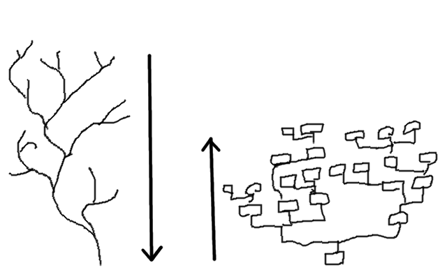 I find it intriguing to compare a chain of command chart with a diagram of a drainage network. As water’s power flows down through a drainage, it converges from many headwaters into one powerful river. As power flows down through the chain of command, it diverges (spreads out) through levels of increasing amounts of subordinates. The two diagrams are almost mirror opposites.
