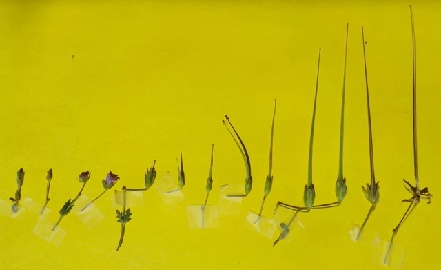 One day at a school, I was field-testing an activity where students found and picked ten samples of Erodium flowers at different stages in their visually-dramatic development from bud into flower into mature seeds and then tape their ten examples in sequence on paper.