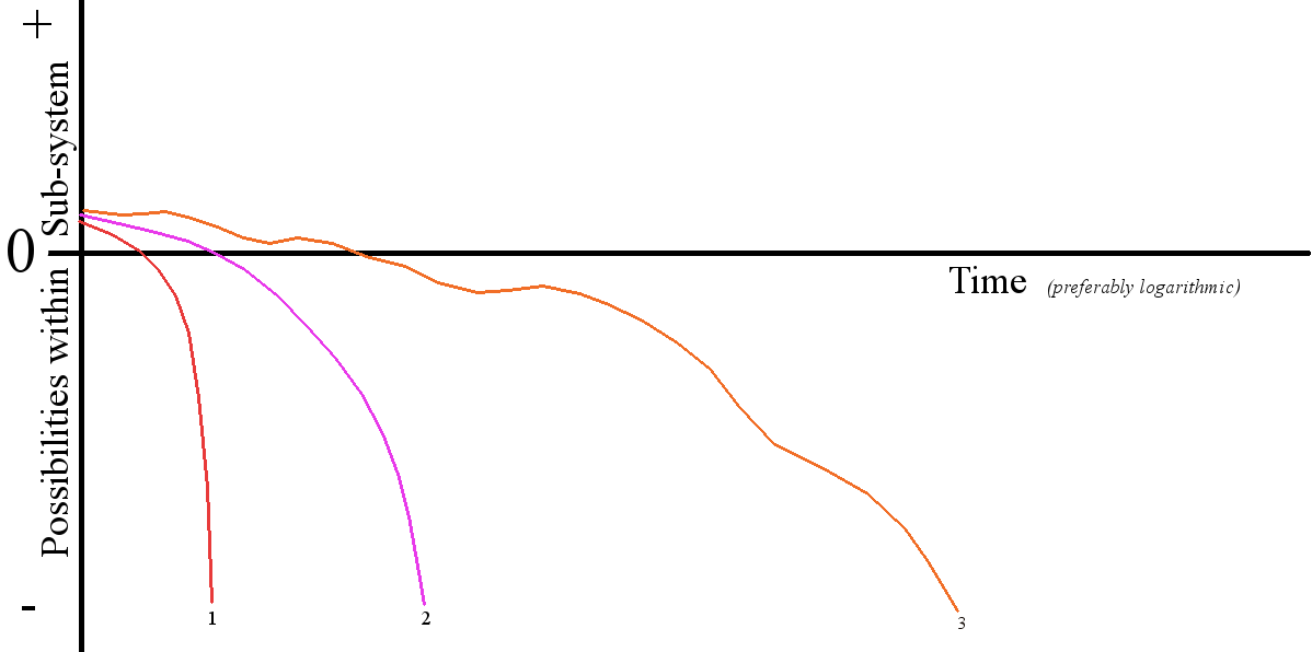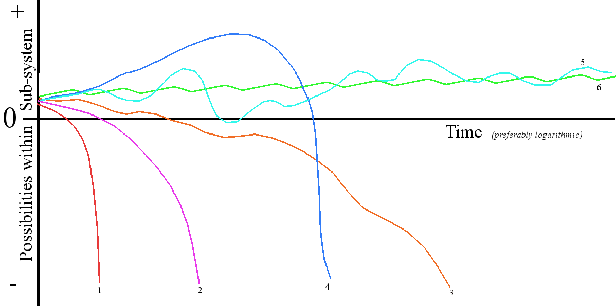 Notice that this graph has a different title for its vertical axis and it has a zero line like the Change in Daylength graph – and for the same reason. This graph shows whether the amount of Possibilities within a sub-system is increasing or decreasing over time. Above the zero line, Possibilities are increasing within the sub-system; below that line, they are decreasing. In terms of individual organisms, the graph shows the Relative Balance between inflow and outflow of usable energy an organism is experiencing through time. Line #1 loses its usable energy right away. This would be like the runt of the litter that never gets a chance to nurse. It quickly fades away. Line #2 is of someone who fails to thrive. They get nourishment. They hang around for a time, but it is, nevertheless, a downward progression. Line #3 is of someone who might make it. The organism occasionally catches something to eat but it can’t get enough. This one lasts longer but eventually runs out of energy and dies.