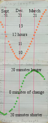 I added the red lines and black labels to show how the midpoint in one graph coincides with an extreme on the other graph. Notice the consistent offset of the two graphs, how the bottom graph, Change in Daylength, leads the top graph, Daylength, by a quarter of the year. For example, the Change in Daylength graph bottoms out on September 21st (Fall Equinox) while the Daylength graph is just reaching the midpoint of its descent. When the Daylength graph finally bottoms out on December 21st (Winter Solstice), the Change in Daylength has risen to the 0 minutes of change line in the middle of the graph which means that: the day before, the days were still growing shorter and now they will begin growing longer. After all, when you reach the shortest day of the year, the next day can’t be even shorter; the daylength has to start growing longer.